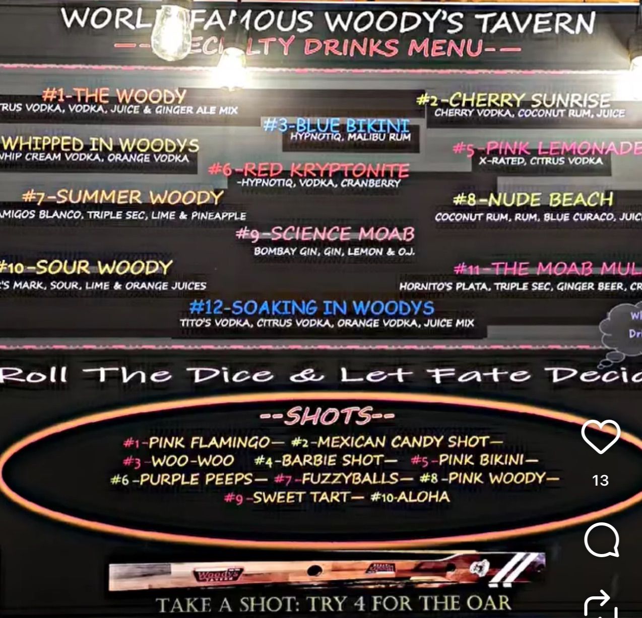 Whether you come for the parks, the trails, the river, the desert solitude, or to jump off a random cliff, a drink at Woody's is a must. If you come to Moab, and don't come to Woody's, did you even come to Moab?